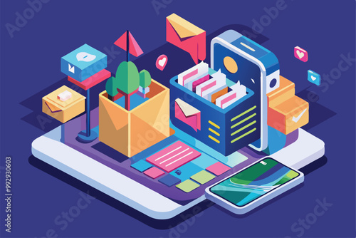 Плоская векторная иллюстрация концепции мобильной аналитики. Изометрические экраны смартфонов с диаграммами и графиками. Взаимодействие пользователей с мобильными сайтами и приложениями.