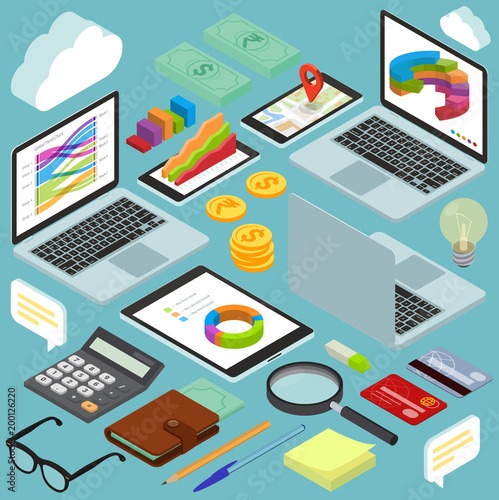 Векторный плоский изометрический аналитический плакат, набор баннеров. Элементы концептуального дизайна мобильной и веб-аналитики.
