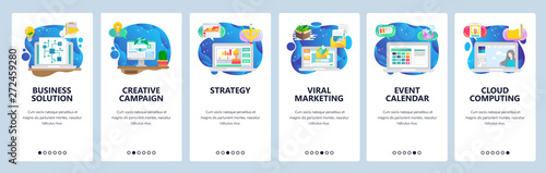 Экраны загрузки мобильных приложений. Цифровой маркетинг, брендинг, дизайн пользовательского интерфейса мобильных приложений, управление проектами. Шаблон векторного баннера меню для разработки веб-сайтов и мобильных устройств. Плоская иллюстрация дизайна веб-сайта.
