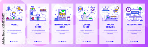 Экраны загрузки мобильных приложений. Гостиничный бизнес, справочное бюро и стойка регистрации, бронирование номеров. Шаблон векторного баннера меню для разработки веб-сайтов и мобильных устройств. Плоская иллюстрация дизайна веб-сайта.