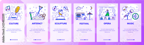 Экраны загрузки мобильных приложений. Мировая культура и искусство, литература, театр, музыка. Шаблон векторного баннера меню для разработки веб-сайтов и мобильных устройств. Плоская иллюстрация дизайна веб-сайта.