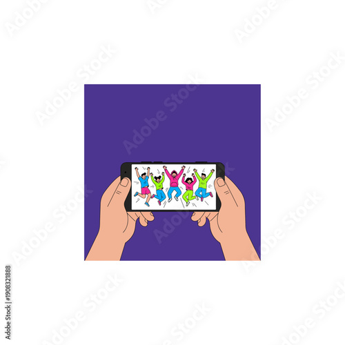 Мобильные игры, векторная иллюстрация дизайна в плоском стиле. Руки держат смартфон с дизайном пользовательского интерфейса видеоигры "Дикий запад" в стиле пиксельной графики и наградой "Кубок победителя". Концепция мобильного игрового приложения.