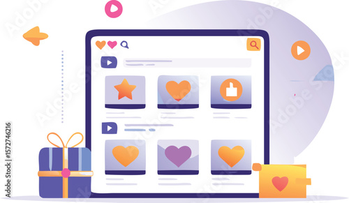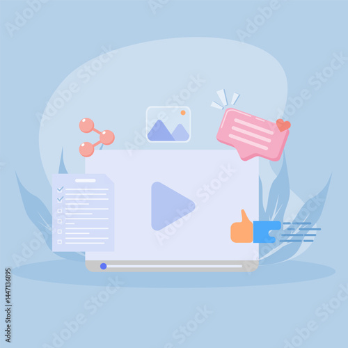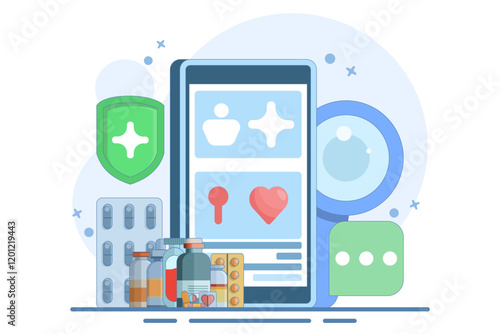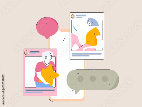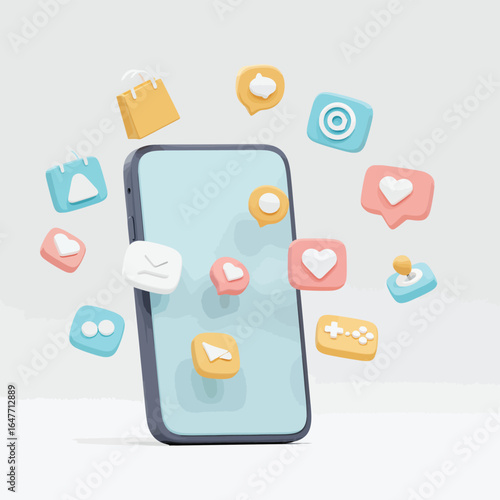 Мобильный телефон с речевым пузырем, диаграммами, рейтингом звезд, электронной почтой, знаками Wi-Fi, плоской векторной иллюстрацией. Мультимедийное коммуникационное устройство, используемое для звонков, обмена сообщениями, общения в социальных сетях и т.д.