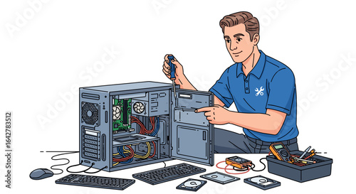 Векторная иллюстрация концепции ремонта мобильного телефона. Мужчина чинит сломанный мобильный телефон. Техническое обслуживание и обслуживание смартфонов. Мужчина использует паяльник для ремонта телефона.