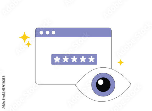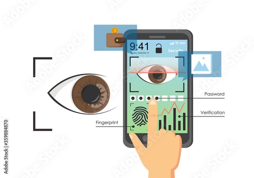 Сканирование глаз, мобильный телефон с методами аутентификации пользователя на экране, векторная плоская иллюстрация. Пароль в сочетании с биометрическими функциями, такими как проверка глаз и отпечатков пальцев. Мобильная безопасность.