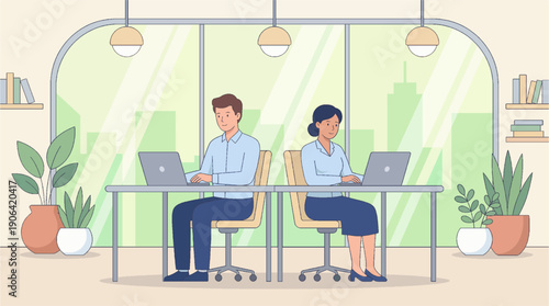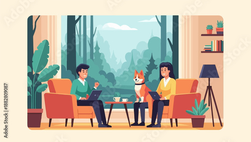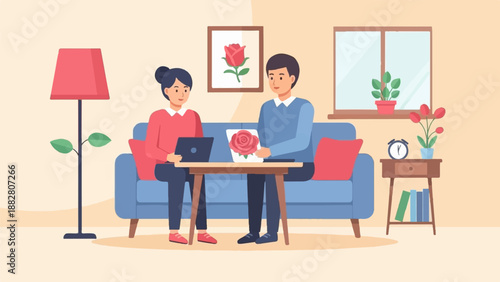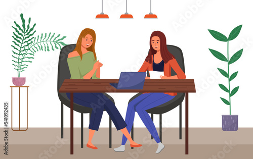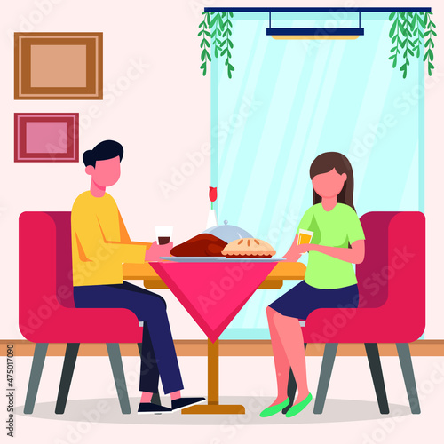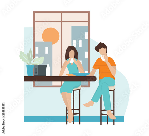 Векторная иллюстрация молодого человека и женщины, сидящих за столом в кафе и использующих смартфон или сотовый телефон. Элемент концептуального дизайна современных гаджетов в плоском стиле.