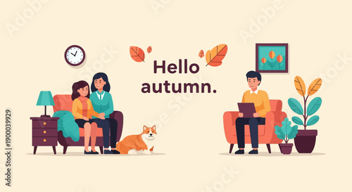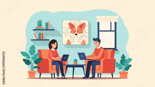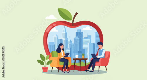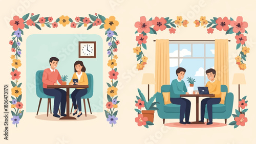 Векторная иллюстрация молодого человека и женщины, сидящих на скамейке с помощью смартфона, планшета. Современные гаджеты для повседневной жизни концептуальный элемент дизайна в плоском стиле.