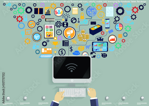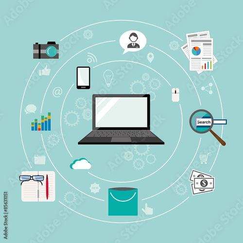 Векторная плоская иллюстрация современных гаджетов. Ноутбук, настольный компьютер, электронная книга, подключенная к power bank, смарт-часы и смартфон. Электронные устройства для фитнеса в домашнем офисе. Плакат с цифровыми тенденциями, баннер.