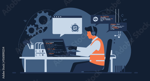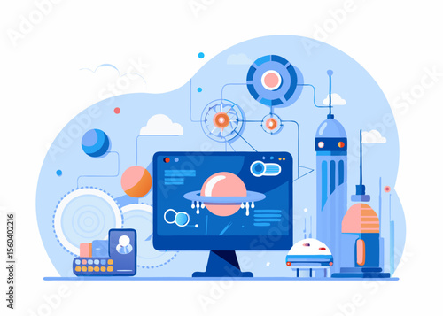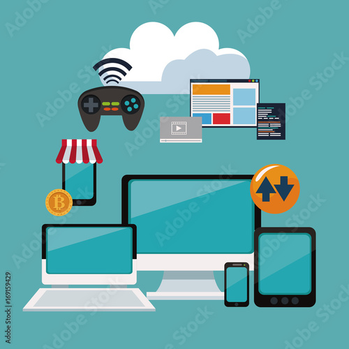 Векторная плоская иллюстрация современных гаджетов. Ноутбук, мобильный телефон, наушники, музыкальный плеер, смарт-часы и ручная камера. Модные электронные устройства и новые носимые технологии плакат, баннер.