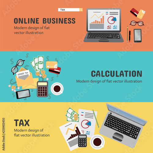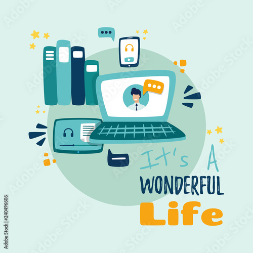 Векторная плоская иллюстрация современных гаджетов. Ноутбук, мобильный телефон, наушники, музыкальный плеер, смарт-часы. Модные электронные устройства и новые носимые технологии плакат, баннер.