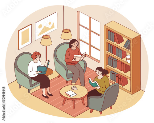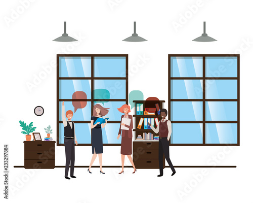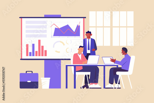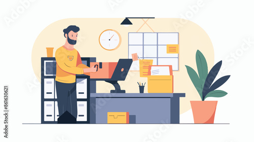 Современное офисное рабочее место с обзорной доской. Счастливая девушка, работающая на портативном компьютере, сидя за столом, плоская векторная иллюстрация. Деловое рабочее место. Визуализация цели и мечты.