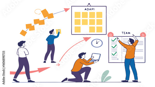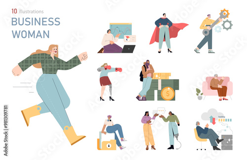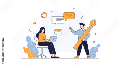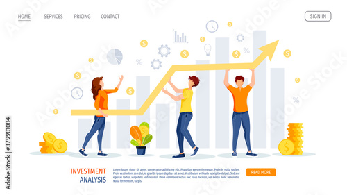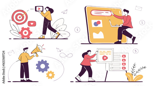 Огромная долларовая банкнота и крошечные люди-промоутеры с мегафоном, телескопом, почтовым речевым пузырем, папкой с документами, векторной иллюстрацией. Акции и предложения по банковскому счету, инвестирование денег.