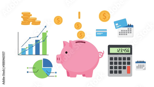 Концепция экономии денег. Векторная иллюстрация в плоском стиле. Копилка, калькулятор и рука с монетой. Финансовые символы и значки.