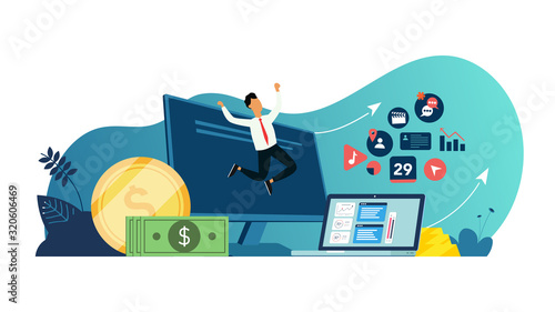Микро-мужские персонажи кладут долларовую монету в огромную копилку, толкают тележку с денежными мешками, векторная иллюстрация дизайна в плоском стиле. Экономия денег, концепция банковского вклада для веб-баннера, страницы веб-сайта.