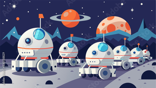 Векторная иллюстрация астронавтов, идущих по поверхности Луны с инопланетянами, работающих на лунном передвижном транспортном средстве, космической базе и оборудовании для исследования космоса. Дизайн в плоском стиле.
