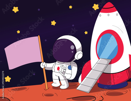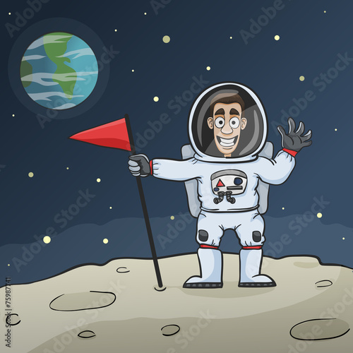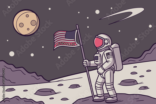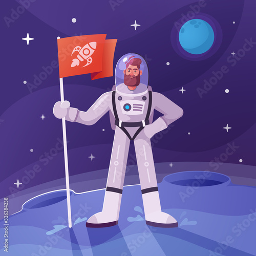 Векторная иллюстрация астронавта на поверхности Луны. Элемент дизайна концепции исследования Луны в плоском стиле.