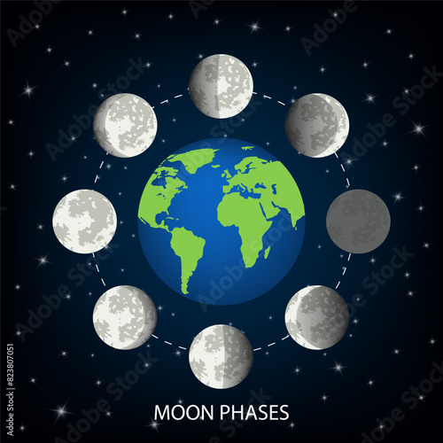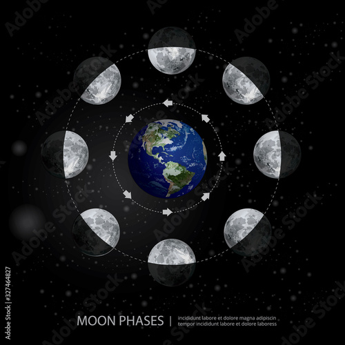 Набор значков фазы Луны. Векторная реалистичная иллюстрация планеты Земля и основных фаз Луны вокруг нее. Концепция всего цикла от новолуния до полнолуния.