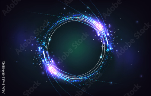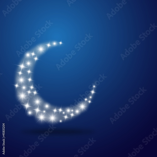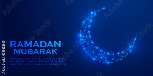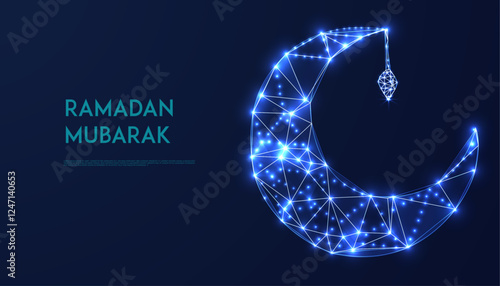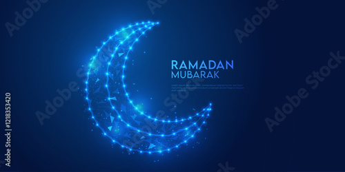 Векторное многоугольное художественное небо в стиле ночного неба с полумесяцем и облаками. Низкополигональная каркасная сетка с рассеянными частицами и световыми эффектами на темно-синем фоне. Шаблон баннера плаката поздравительной открытки.