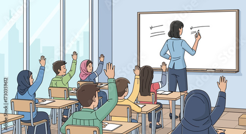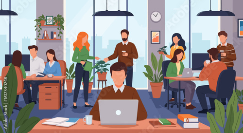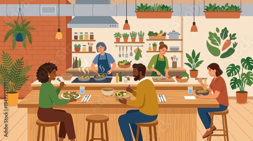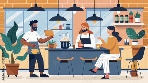 Утренний кофе в кафе концепция векторной иллюстрации. Люди за столиком в ресторане пьют чай. Встреча друзей за завтраком. Люди пьют горячий чай и разговаривают. Женщина заказывает кофе у стойки.