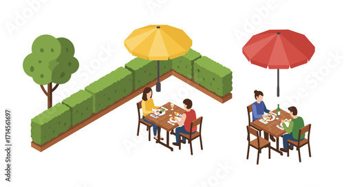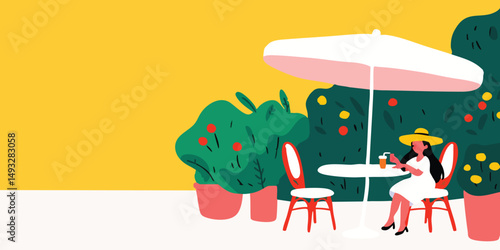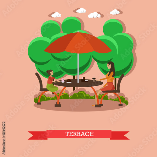 Мать и ее дочь сидят на летней террасе ресторана под зонтиком. Семья в уличном кафе векторная иллюстрация в плоском стиле дизайна.