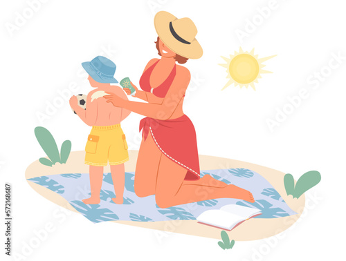 Мать наносит солнцезащитный крем на векторную иллюстрацию кожи сына. Мама и маленький ребенок отдыхают на пляже, загорая под жарким солнцем летом. Праздничный отпуск на морском побережье