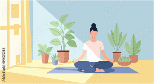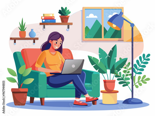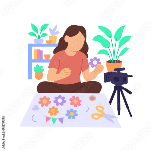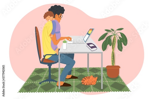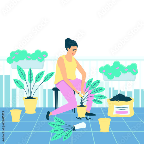Мать с новорожденным ребенком плоский вектор. Мама держит на руках новорожденного ребенка и поливает домашний цветок иллюстрация. Материнство, утроба матери и распорядок дня счастливой семьи
