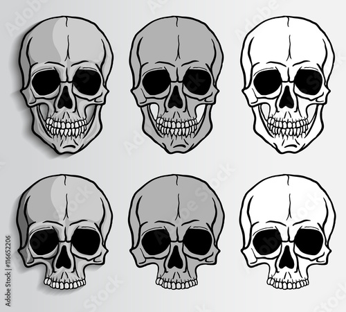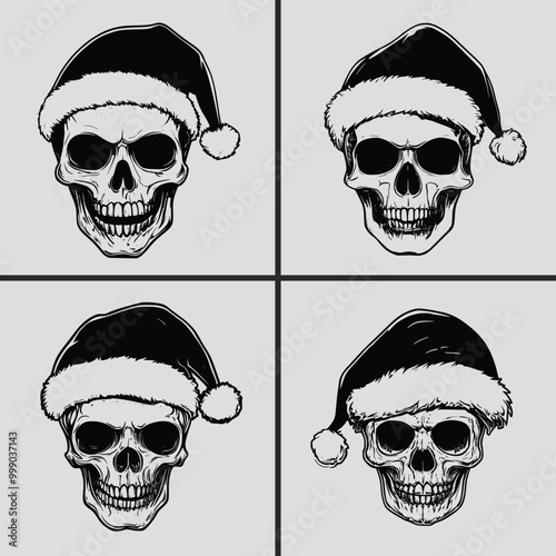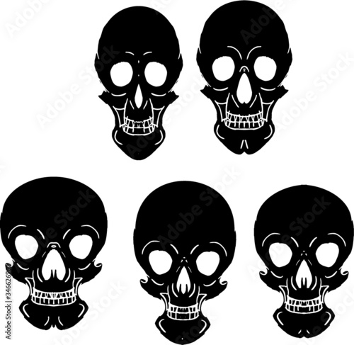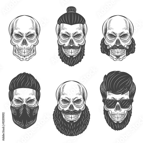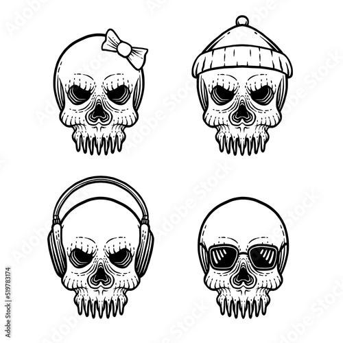 Набор черепов мотоцикла, векторная рисованная иллюстрация, изолированная на белом фоне. Монохромный череп в шлеме, защитных очках и шарфе для лица с велосипедной маской. Графика на байкерской футболке.