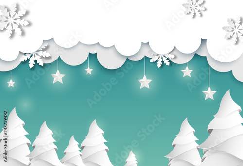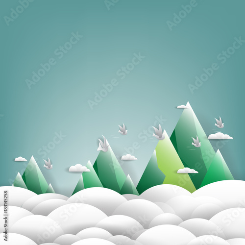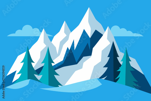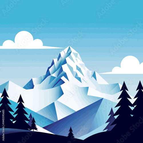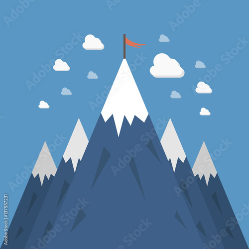 Веб-баннер для альпинизма, шаблон плаката, векторная иллюстрация в стиле бумажного искусства. Альпинист, стоящий рядом с флагом на вершине горы. Экстремальные зимние виды спорта. Восхождение на горы, зимний туризм.