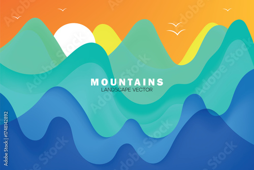 Горы, вырезанные из бумаги на фоне 3d-вектора природы. Иллюстрация лесного пейзажа в художественном стиле в стиле ремесла. Многослойный весенний или летний дизайн оригами с травой, солнцем и облаками. Путешествия, туризм и приключения