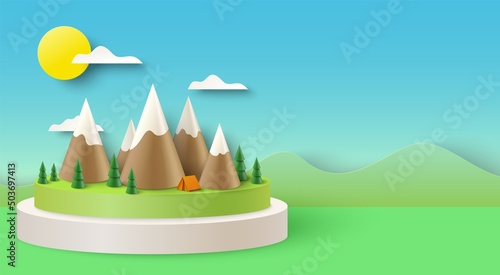 Горы с канатной дорогой, лес, лодка, палатка на берегу реки, векторная иллюстрация в стиле бумажного искусства. Горный кемпинг, шаблон плаката для летнего кемпинга.