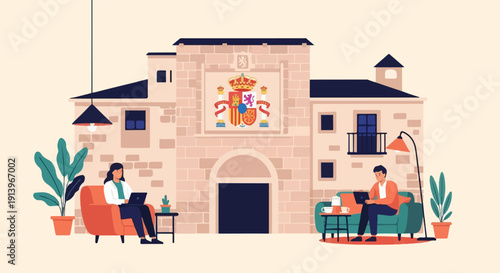 Грузчики загружают движущийся грузовик картонными коробками, переносят диван, плоскую векторную иллюстрацию. Люди переезжают в новый дом. Услуги компании по переезду.