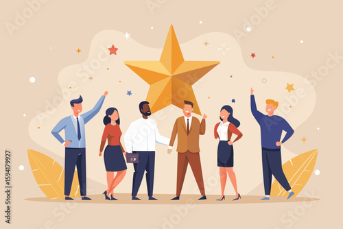 Векторная иллюстрация церемонии вручения кинопремии. Огромная золотая звезда, приз кинофестиваля и крошечные персонажи с видеокамерой, микрофоном. Киноиндустрия, концепция кинопремии для веб-баннера, страницы веб-сайта и т.Д