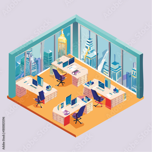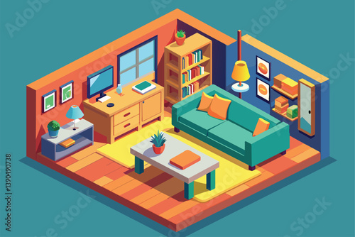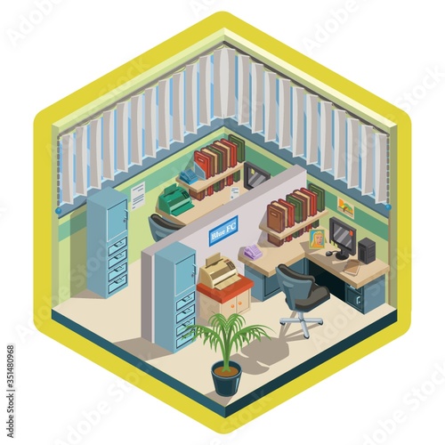 Здание кинотеатра в изометрическом стиле. Векторные плоские 3d иконки. Интерьер кинотеатра, кафе, билетной кассы.