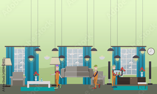 Векторная иллюстрация грузчиков, перевозящих диван, телевизор. Услуги компании по переезду или доставке элементов дизайна в плоском стиле.