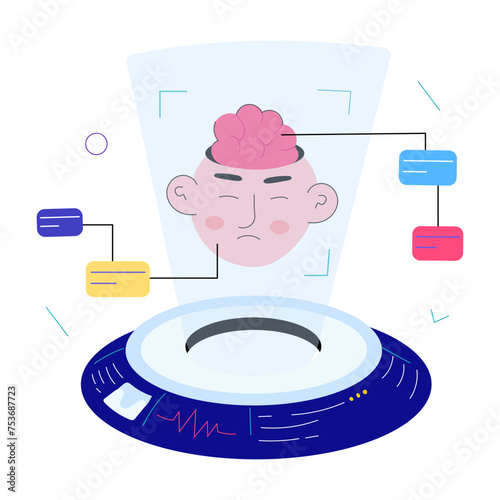 МРТ-исследование. Врач делает МРТ головы или головного мозга пациентки женского пола, плоская векторная изометрическая иллюстрация. Магнитно-резонансная томография. Томография головы, неврологическая лаборатория.