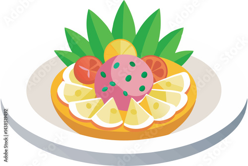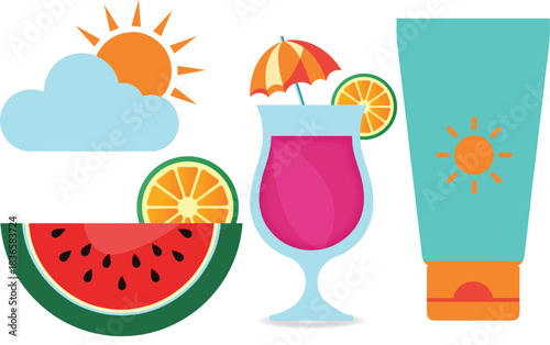 Бутылка для напитка из мультифруктового сока, свежий арбуз, клубника, цитрусовые, брызги и капли жидкости. Векторная иллюстрация в стиле бумажного искусства. Шаблон рекламы смесей фруктовых соков Mix multi.