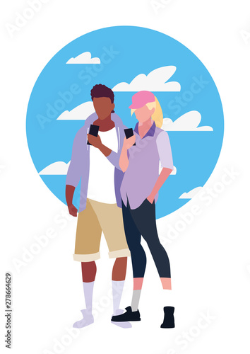Вектор многорасовой пары. Семейная сцена в квартире международных людей. Иллюстрация счастливых объятий молодого мужчины и женщины. Многонациональный портрет супружеской пары мужчины и женщины. Отношения и скрепление