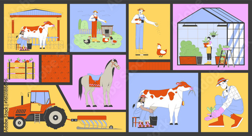 Многоэтажный жилой дом с шумными соседями, живущими в нем, плоская векторная иллюстрация. Группа танцующих людей, кричащая пара, мужчина, сверлящий стену, лающая собака у входной двери, играющие дети.
