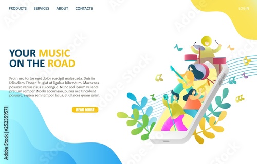 Ваша музыка в дороге векторный шаблон веб-сайта, дизайн веб-страницы и целевой страницы для разработки веб-сайтов и мобильных сайтов. Смартфон с поющими людьми, играющими на музыкальных инструментах. Концепция музыкального приложения.