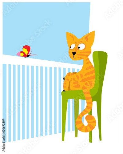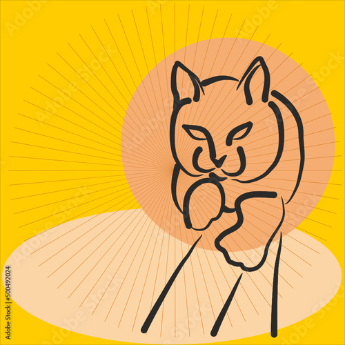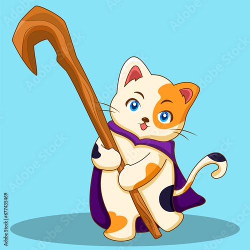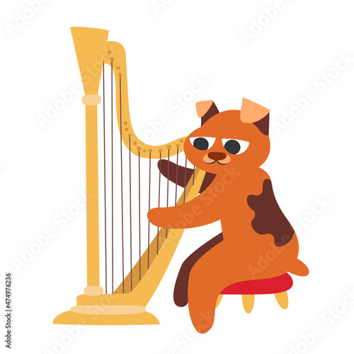 Музыкальный кот, играющий на арфе в векторе. Мультяшный забавный персонаж-музыкант. Котенок, дающий музыкальное представление, изолированный на белом фоне