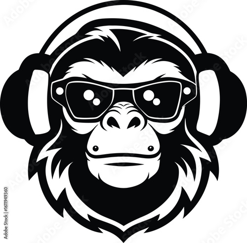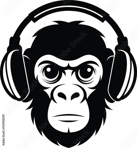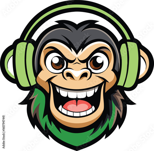 Векторная иллюстрация гранжа на футболке обезьяны с наушниками. Шимпанзе слушает музыку.