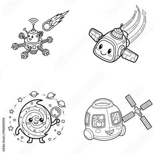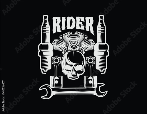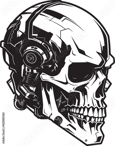 Набор музыкальных черепов с видом сбоку, векторная рисованная иллюстрация, изолированная на белом фоне. Человеческий череп с ирокезами, в шляпе и кепи, слушающий музыку в наушниках.