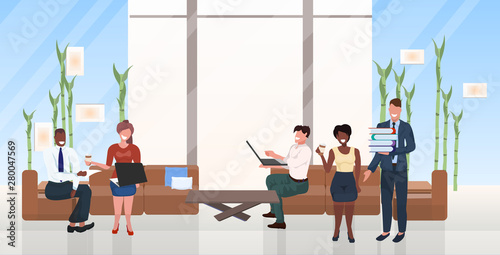 Векторная иллюстрация музыкантов, выступающих на сцене ресторана, посетителей, обедающих и слушающих музыку. Дизайн в плоском стиле.