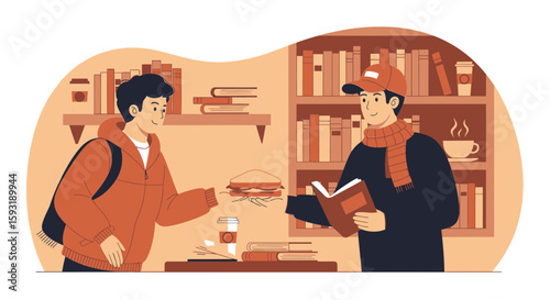 Счастливая мусульманская семейная пара в парфюмерном магазине, плоская векторная иллюстрация. Саудовские арабы мужчина и женщина в традиционной арабской одежде с хозяйственными сумками. Парфюмерия, интерьер универмага.