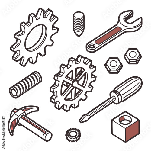 Гвозди, винт-болт, изолированный набор изометрических векторных иллюстраций. Инженерный крепежный инструмент различной формы, очертаний и положения, изолированный на белом фоне