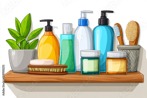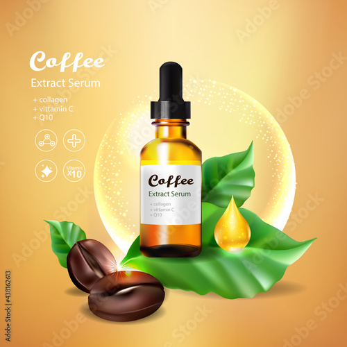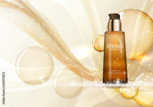 Шаблон баннера плаката с натуральным кокосовым маслом. Векторная реалистичная композиция из бутылки масла, кокосовых орехов, брызг кокосового молока, пальмовых листьев и пространства для копирования. Реклама косметических средств с органическим кокосовым маслом.