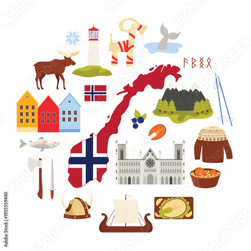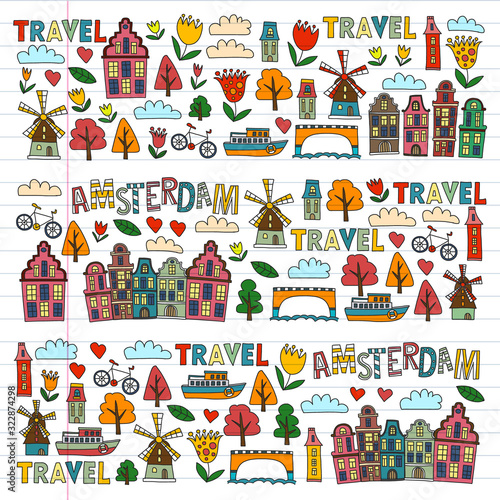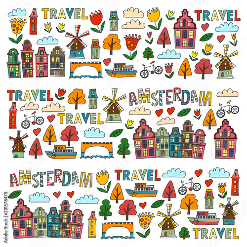 Символика Нидерландов и значки путешествий по Голландии в изолированном наборе. Векторная иллюстрация архитектурного здания Амстердама, известных туристических достопримечательностей, карты, традиционной кухни и национального флага