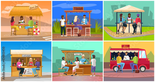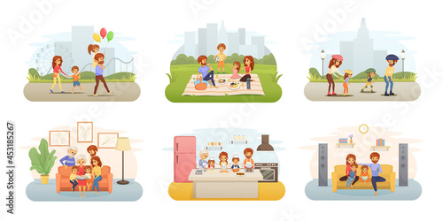 Набор сцен Нового года и Рождества, плоская векторная иллюстрация. Счастливые женщины готовят праздничный ужин, готовят рождественские подарки, пара празднует зимние праздники, Санта-Клаус дарит подарок девочке.