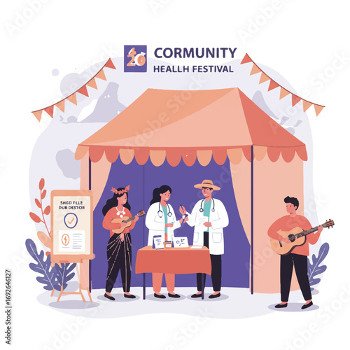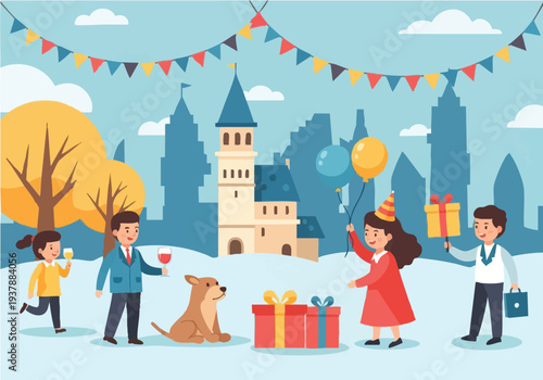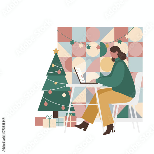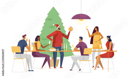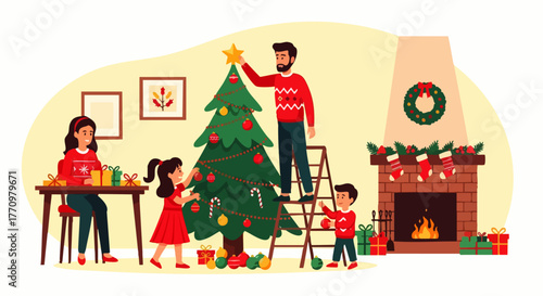 Микро мужские и женские персонажи украшают камин рождественским венком, чулками, свечами и готовят подарки, векторная иллюстрация. Концепция празднования Рождества и Нового года.