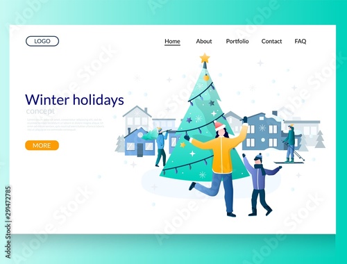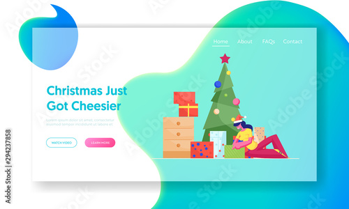 Новогодний векторный шаблон веб-сайта, дизайн веб-страницы и целевой страницы для разработки веб-сайтов и мобильных сайтов. Шляпа Санты, борода и усы, подарочные коробки, рождественский чулок, елка, свечи, звезда.